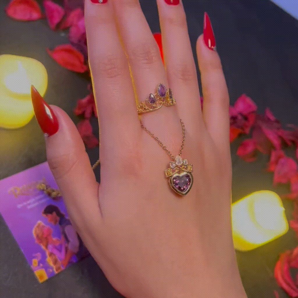 Este conjunto incluye un collar y un anillo inspirados en cuentos de hadas elaborados con acero inoxidable y un fino baño en oro de 18k. Es hipoalergénico con dije de cobre de alta calidad. Empaquetado en una caja rosa con forma de corona, está listo para regalar nada más sacarlo de la caja.